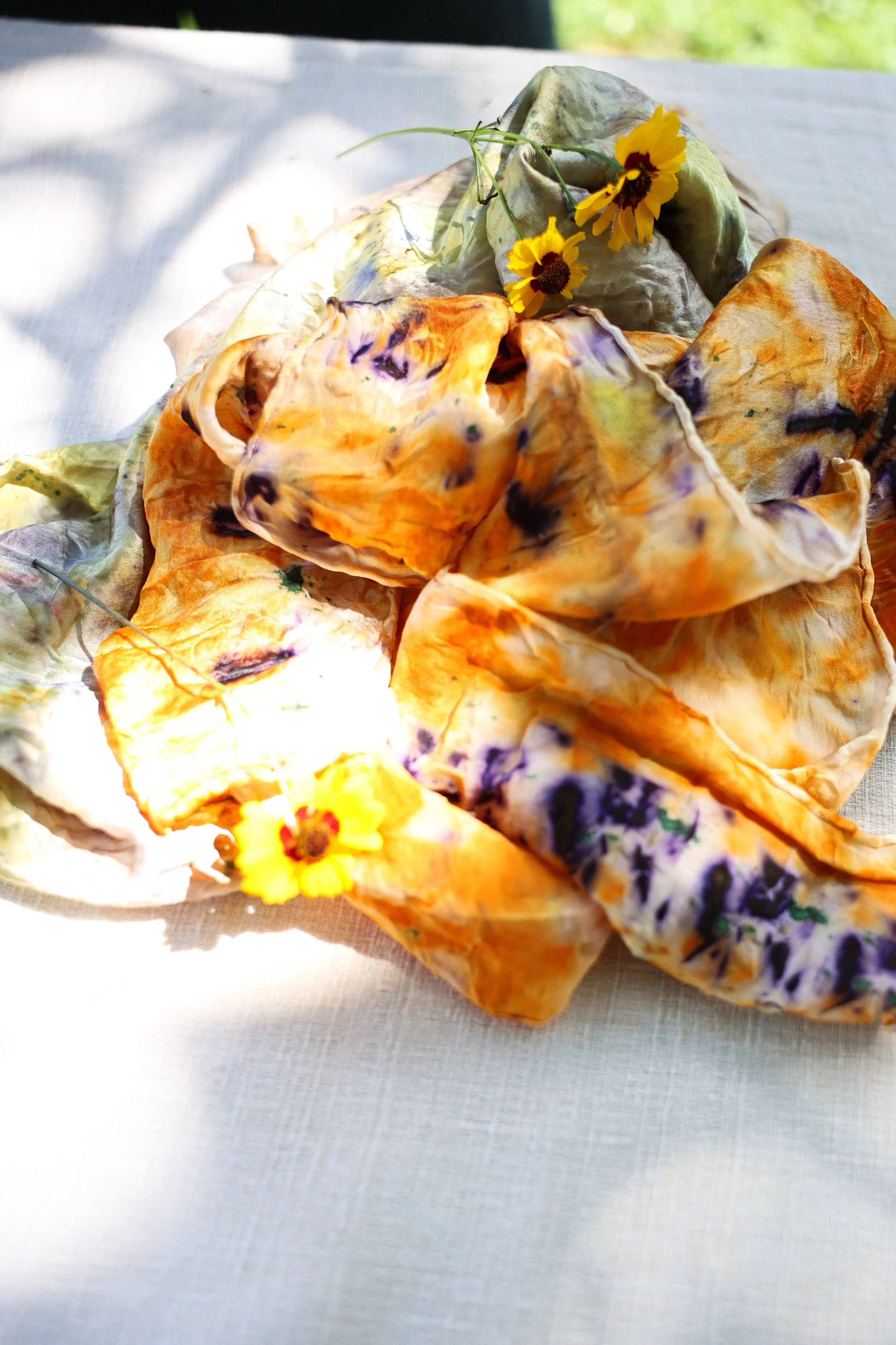 During these events, Kelly will guide your group through creating a naturally-dyed piece. This can be done together through a larger piece, such as a large scarf, baby blanket, or throw to be gifted to a loved one as a symbol of care. Or we can each make pieces individually, such as onesies, silk scarves, or bandanas, to experience learning this craft with friends or family.
